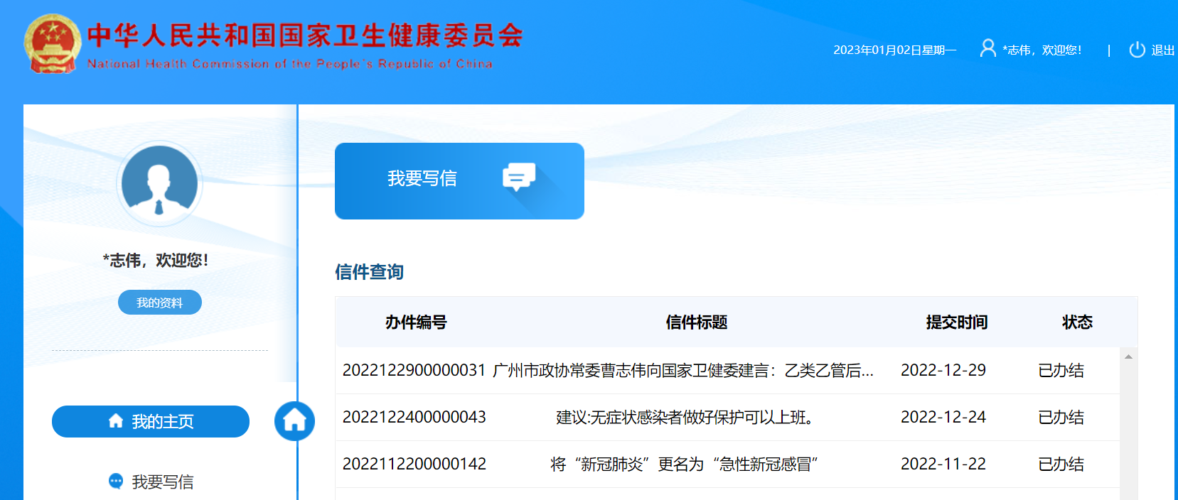 2022年11月22日,曹志伟通过线上公开渠道,向国家卫健委提交了抗击新冠疫情建议,次日得到回复和感谢鼓励。