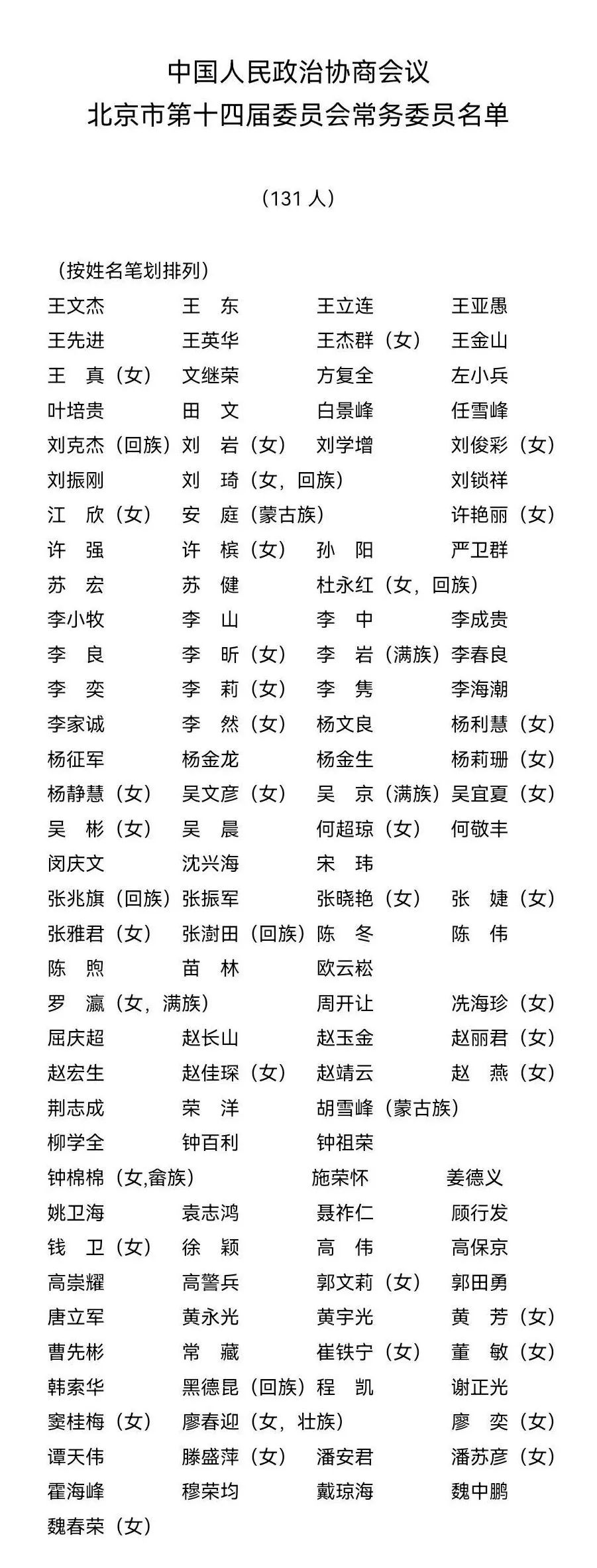 1月18日上午,政协北京市第十四届委员会第一次会议举行第三次全体会议,进行大会选举。大会选举产生了由主席、副主席、秘书长和131位常务委员组成的政协北京市第十四届委员会常务委员会。