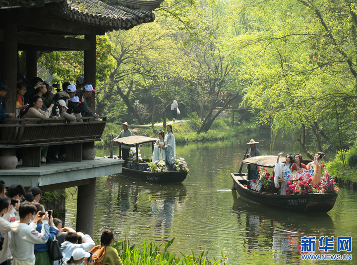 游客在杭州西溪湿地观看宋韵花朝节游船巡游(2023年4月2日摄)。新华社记者 翁忻旸 摄