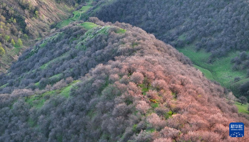这是4月20日在吐尔根杏花大峡谷拍摄的野杏林(无人机照片)。新华社记者 李响 摄