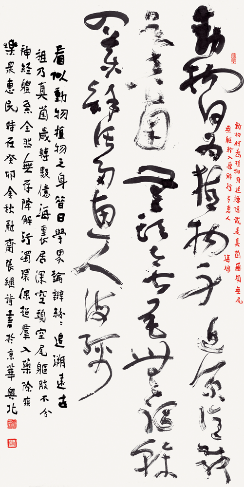 于二十一世纪之今日,张继书法篆刻之艺文兼备,绘画之意境气韵,诗联之情真意切,皆展其对中国传统文化之追慕、对伟大时代之歌颂。金石画卷,皆铺陈中华文化精神之宏大主题。其以灵动且深刻之艺术语言,常表既具民族性又丰富清朗之题材。此浑然丰盈之艺术自觉,乃其所求之文化真意,浪漫、鲜活而纯粹,既有秦汉雄风之正大气象,亦为当下伟大时代“昂首再启程,共筑中国梦”之真实写照。