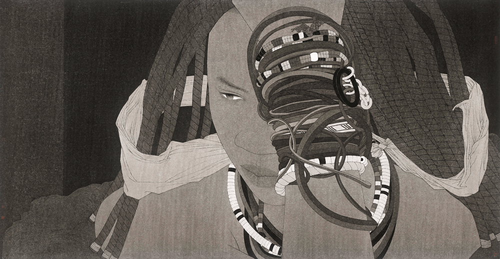 在技法的运用上,我采用了工笔线描与水墨色块相结合的方式。通过运用各种不同变化的线条,刻画人物的表情、皮肤、发丝、项圈、串珠、配饰、衣饰纹路等细节,以及各种毛皮和金属饰物的不同质感。线条由短及长,反复穿插,疏密交错,以不同的速度、节奏表现出画面的韵律与层次感,使画面更加丰富、饱满且富有肌理质感。以不同的灰色调来表现人物的皮肤肌理与服饰质感,以黑、白、灰及其衍生色为基调,又以多种线形浓墨块面来点缀和扣住造型,使主体人物更为突出。我力求在画面中既展现藏族文化的精致与细腻,又表现新时代背景下藏族民众的豪迈与奔放。