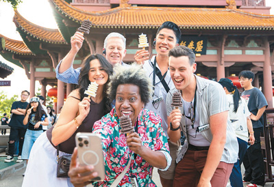 外国游客在湖北武汉黄鹤楼前手持文创雪糕拍照。