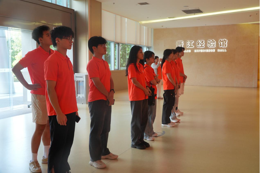 下午,实践队步入晋江经验馆,开启一场探寻发展密码的思想之旅。通过翔实的图文史料与震撼的数字沙盘全景演示,队员们系统学习了“晋江经验”孕育、发展、深化与升华的四个关键阶段,深刻领悟其“六个始终坚持”的核心内涵与需处理好的“五大关系”。晋江从县域经济样板迈向高质量发展典范的壮阔历程,为青年学子理解中国式现代化的基层实践提供了生动教材,激发了投身国家建设的使命感。