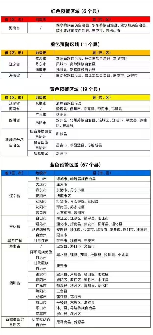 预计,8月24日20时至8月25日20时,辽宁东部、海南南部等地部分地区发生山洪灾害可能性大(橙色预警),其中,海南南部局地发生山洪灾害可能性很大(红色预警),预警区域涉及的县(市、区)见下表。其他地区也可能因局地短历时强降水引发山洪灾害,请各地注意做好实时监测、防汛预警和转移避险等防范工作。