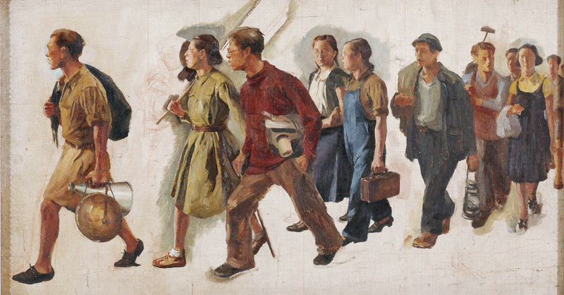 这幅以武昌艺专师生为原型的作品,突破了传统历史画的宏大叙事。唐一禾巧妙融合巴黎美术学院习得的写实技法与民间年画的装饰风格,使作品既具严谨造型,又富街头宣传画的烟火气息。人物衣纹笔触粗犷,色调温暖明亮,展现出知识青年“艺术即战场”的信念。