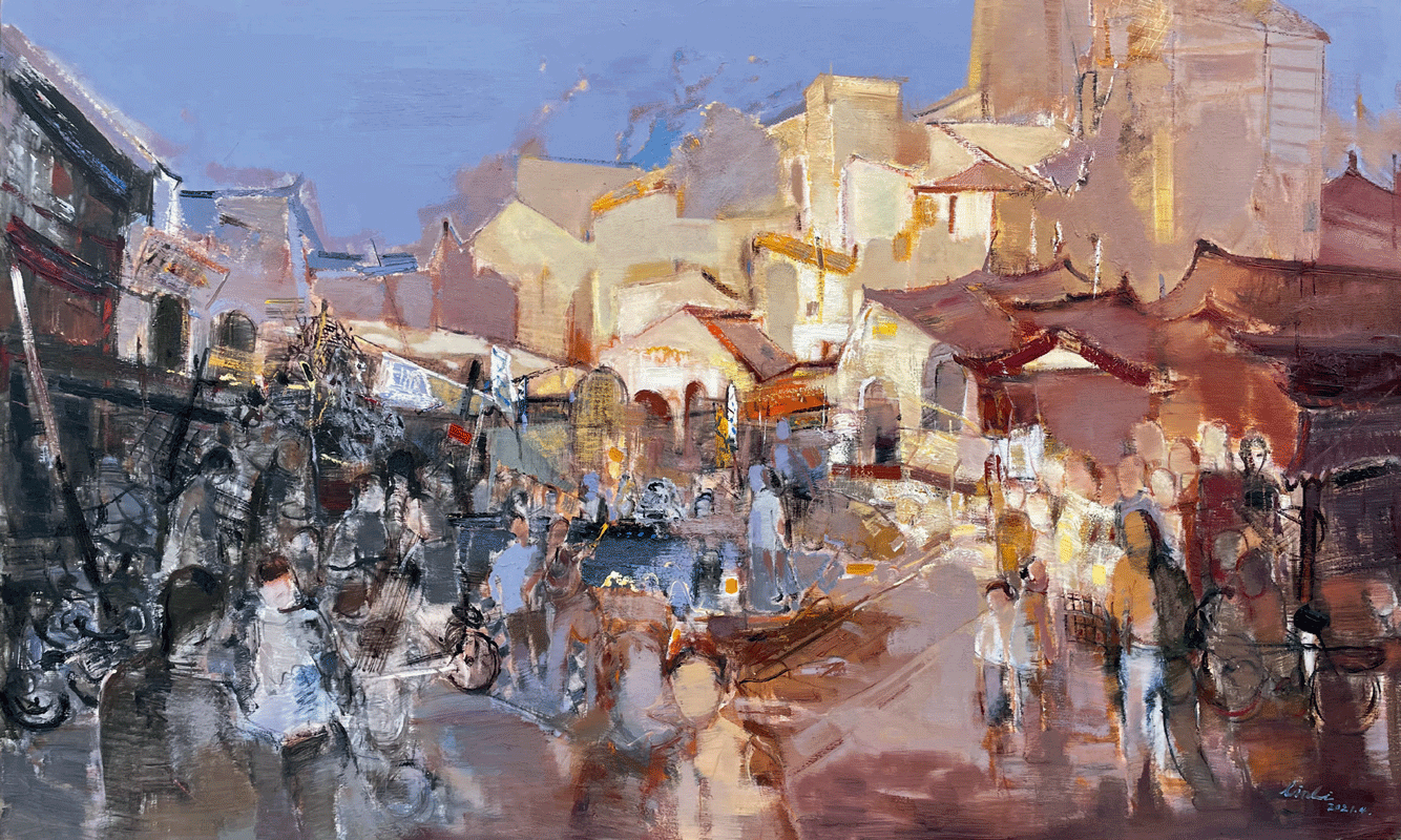 林丽的创作始终扎根于对故土文明的深切凝视。《故园清韵》系列中,那些被藤蔓缠绕的梁柱、覆满青苔的石阶、充满表现性的蓝紫色调,表达出了一种对诗意栖居的向往之感。而在《繁华依旧》《夏日之约》等新作中,她将目光投向当代城乡的鲜活图景,以跳跃的明艳色块与动态构图捕捉市井生活的烟火气,展现出艺术家对社会变迁的敏锐触觉。她这种既有“怀旧乡愁”、又有“在场叙事”转向的创作常态,正体现出一位成熟艺术家对现实语境的主动回应。
