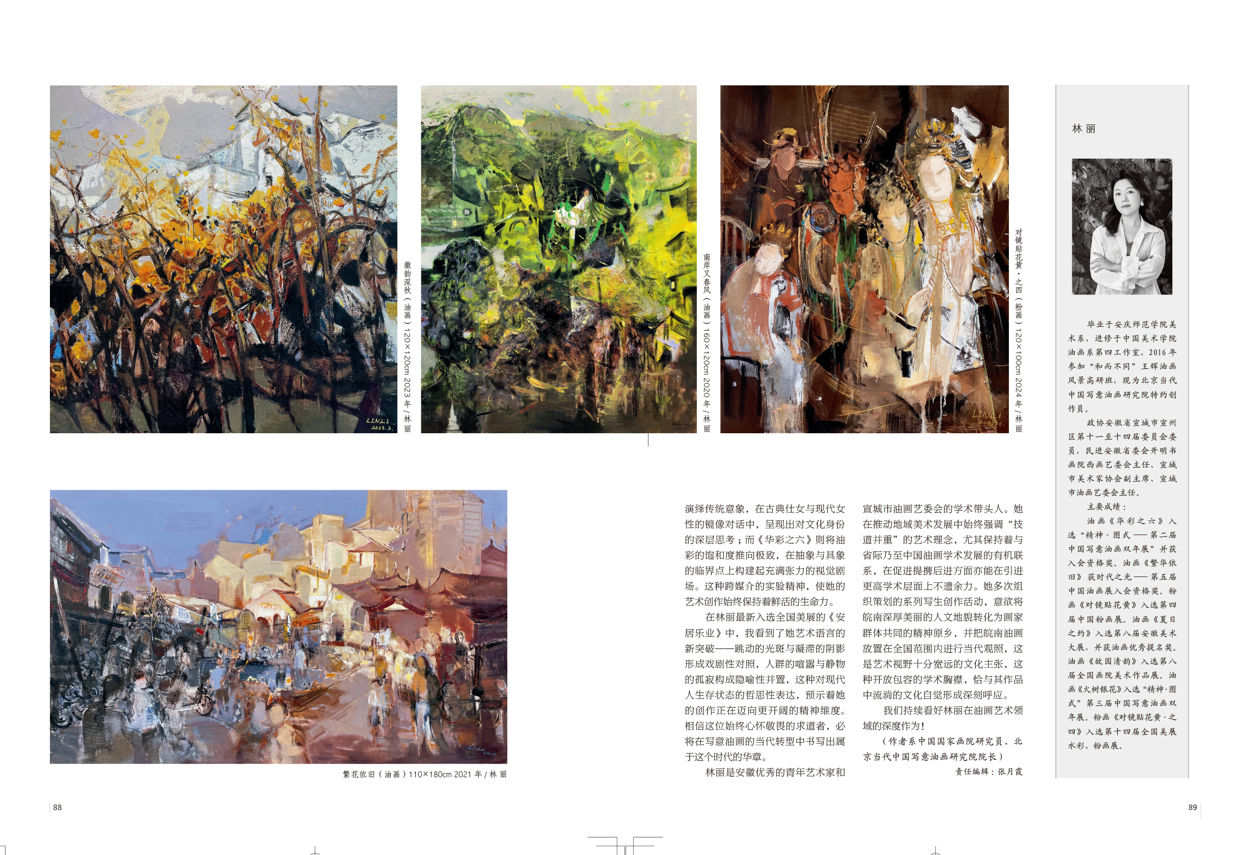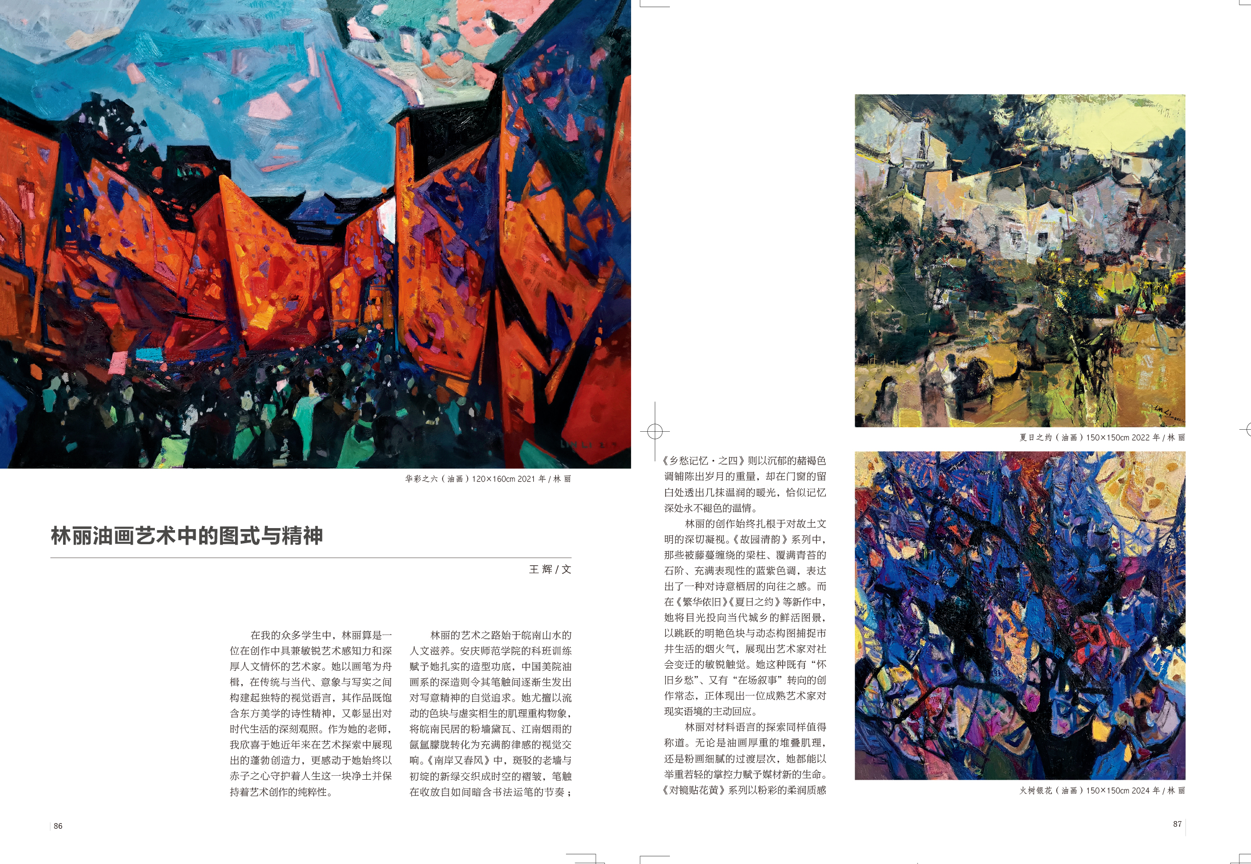 林丽是安徽优秀的青年艺术家和宣城市油画艺委会的学术带头人。她在推动地域美术发展中始终强调“技道并重”的艺术理念,尤其保持着与省际乃至中国油画学术发展的有机联系,在促进提携后进方面亦能在引进更高学术层面上不遗余力。她多次组织策划的系列写生创作活动,意欲将皖南深厚美丽的人文地貌转化为画家群体共同的精神原乡,并把皖南油画放置在全国范围内进行当代观照,这是艺术视野十分宽远的文化主张,这种开放包容的学术胸襟,恰与其作品中流淌的文化自觉形成深刻呼应。