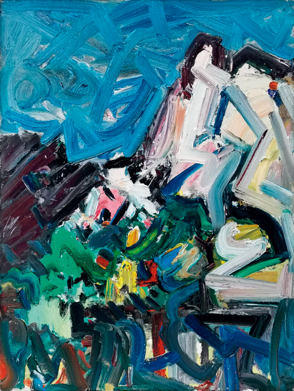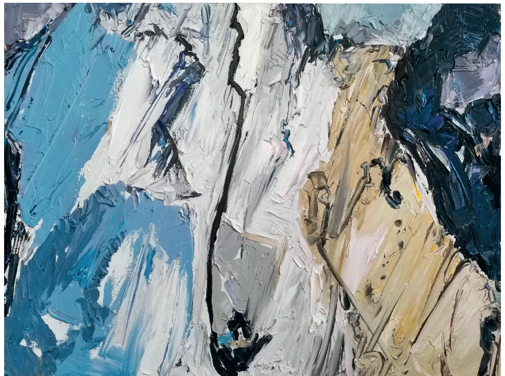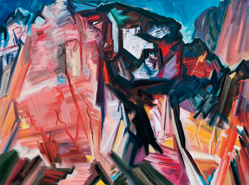 骆根兴的油画写生既回应了多元文化互鉴所带来的时代馈赠,又饱满抒写了当下个人精神的真实状态。他曾说过:“绘画是画出比眼见更深沉的真实”,并“通过各种不真实,达到心灵的真实”。在置身写生现场时,他面对画布犹如面对虚空,强调精神的自由与观看的智慧,每一张画都充斥着碰撞与较量,反复地解构与重构,最终在不断深入与拓展中完成情景合一的生命重建。如《火热天山》《峡谷铁壁》等作品,“抽出符号的表现,将自然打散重新组装”,呈现出山体表相所蕴含的剧烈节奏和巨大能量,暗合了“只有在不和谐之间才能产生的最动人的和谐(赫拉克利特语)”的对立统一观念;画面既神秘深邃,又粗野奔放,扭曲的外在变形准确地凸显了精神的写实,那种来自心灵冲击与情感积累的喷发,雄强刚毅地昭示出自然的伟岸与生命的壮观。《杨家沟》写生系列,将黄土高原的厚重苍茫与革命历史的风云激荡幻化成团块的造型,沉厚的色彩,狂放的笔触,律动的线条,时空变换的尘烟中若隐若现出沟壑、窑洞,油画颜料及肌理所产生的厚重的物质感,与抽象和具象相融合且充满象征意味的历史感,共同营造出一种岁月虽然模糊了容颜,但耳边却依然鼓角铮鸣的壮怀激烈与宏阔意境。他的作品除了“形”和“色”的魅力之外,还有一种超越客观对象的材质美;他将自己最纯粹、最原初的情感与油画最本质的元素相结合,使作品通过对绘画本体语言的探索回归到人类的精神家园。