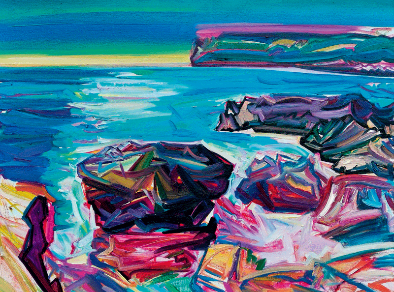 鲜明的艺术个性是骆根兴油画写生给人突出的视觉印象。他认为:“绘画的价值意义,在于凸显精神,彰显个性。”个性作为艺术家性格、感情和修养的合成体,在创作中只能是自然流露而不可刻意为之。他清楚地意识到“绘画具体到每位画家,主导他根上的东西是遗传基因与人生历练所带来的所感所悟,借此表达人的存在意义和价值、生活态度和艺术理想。”相对于个体而言,个性是与生俱来的,而对于艺术创作来说,如何避免迷失自我、丧失个性,并非是件简单的事。骆根兴认为:“将客观的自然上升为呈现内在精神的形式,艺术将独特的个人化的内在精神体现出来的时候,独特的艺术形式也就显现了。”“艺术就是画自己,把自己看清楚,看清楚自己的感觉,尊重自己的感觉,真实表达自己的感觉。”而保持从自我的角度去观察体验世界并实现诚实投入的个性表达,不仅要有技术的储备和更新,更要具备观念的自觉和思考的深度。他知晓画布上的每一根线条、每一块色彩的客观存在只有与符号的主观识别相互作用后,才会赋予现实的传递价值。只有“出新意于法度之中,寄妙理于豪放之外”(苏轼语),才能真正抵达对主体生命的内在开掘与释放的层面。比如他的《涠洲鳄鱼岛》写生,通过有效地掌控和利用情感的宣泄与情绪的导向,将立体化的造型归纳与符号化的色彩升华转换成纵横交错的笔触铺陈和意境营造,使客观提炼与主观存在构成有机整体,实现了艺术之相与真实之相合二为一。独树一帜的语言承载着情感投射和个人洞见,使直面自然所补充的个体“能量”旋即在画布上获得了更加自由的绽放。