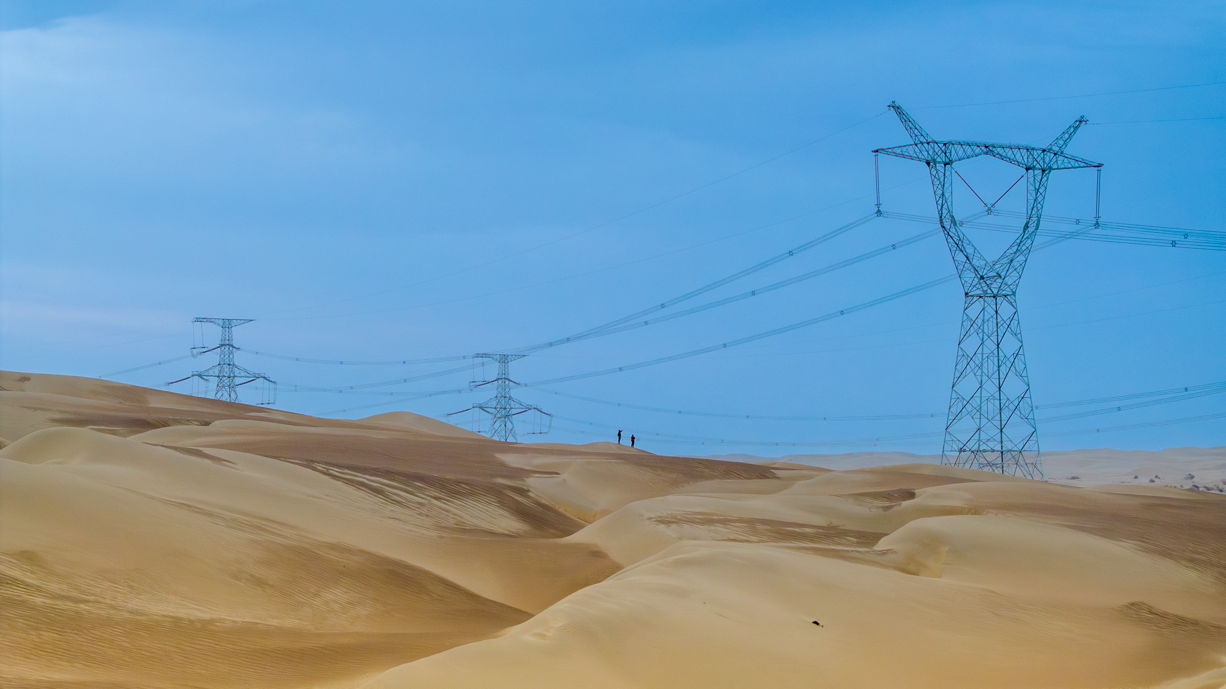 2025年,国家电网历时15年建设的环塔里木盆地750千伏输变电工程全线贯通,图为巴州—铁干里克—若羌750千伏输变电工程。