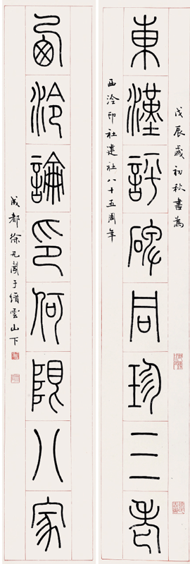 为西泠印社建社八十五周年书“东汉西泠”八言联(书法)133.5×22.5cm×2 1988年 /徐无闻 西泠印社藏