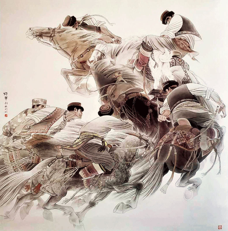 我欣赏他那幅具有旋转动感的《叼羊》,以线的流动辅以水墨淡彩,把前行的人物和骏马表现得生动鲜活,线的表现力得到充分的发挥。我钟爱那幅《无花果》澄明清透的色调,以没骨法与双勾填色的联姻,凸显维吾尔族女子的圣洁与纯朴。我也赞赏那幅大景观小人物的《姑娘追》,富有理想主义色彩的装饰性意味使我联想起《康定情歌》的音乐旋律、是那样的抒情和令人回味。那幅黑白分明的《千里云月》中所表现仰首嘶鸣的白马,更是沁人心脾。郐振明的工笔作品经过精心架构,力求每一幅作品都有闪光之点、感人之处,在此难以言尽,观者自会在他的作品中品味赏析。