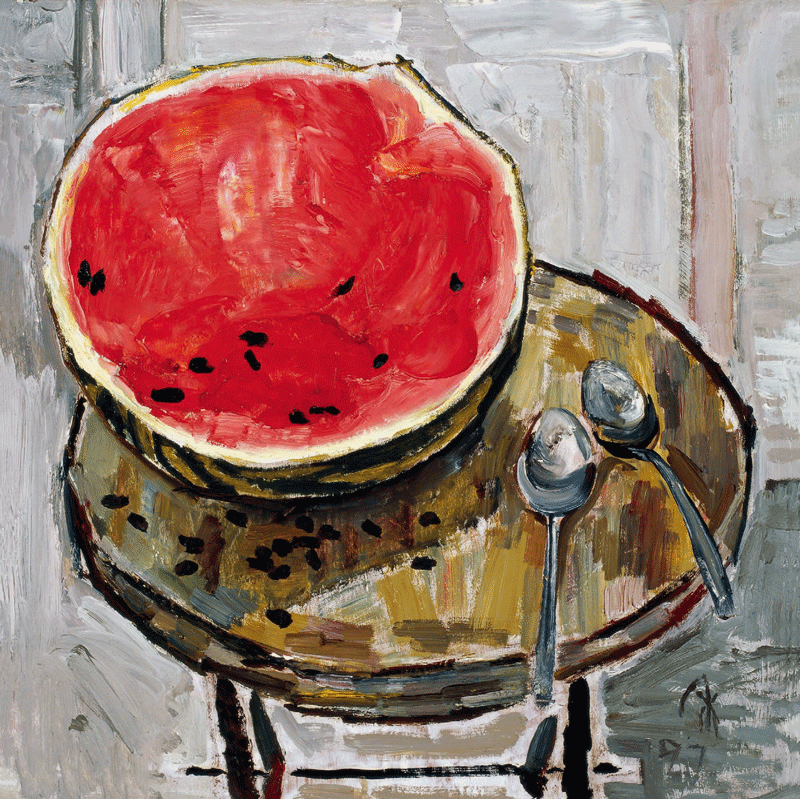 戴士和出生于北京,在他颇具历史意味的早期资料中,我们读到那种在北海荡起双桨、在中山公园长廊中看画展的共和国童年。戴士和的绘画中氤氲着的京味,特别地表现为一种对小物件、小事情、小人物的特殊观照。他的风景,小风小景,只若山川河流、人居乡市的小片段,却充满色彩的悸动与风情。所谓“一丘一壑亦风流”。他的静物,一摞书、半杯茶、楼梯墙角、春窗一隅,兀自有一份画外墨白、清风明月。这画展的海报:那西瓜瓤瓢红特写与“三伏天”形成锵然对照,独具京腔飒飒的风味。他的人物,无不是凡常百姓,生活中人,一如街坊的偶遇。他的一系列成双配对的双人肖像,特别有那种风尘伴侣的韵味,漫写中调着京腔般的幽默。他笔下的大师,均是可亲可爱的熟人,白石老人如邻家老者;宾虹先生,素影纤纤;林风眠先生,虽经过素描肖像的推敲,最后还是画就两袖清风、一蓑风雨的老人。画中的人物无不镶嵌着入彩入神的情味。戴士和先生的京味,是有形象锋芒的京味,又是透着人文关怀和温情的京味。