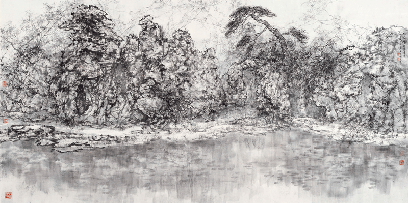 为承载这份“虚境”,王明明坚持使用数十年以上的老纸与沉墨。如同食材新鲜方显真味,老纸褪尽火气,才容得淡墨万千层次。当青年画家们追逐西方绘画中的强烈对比时,他选择回归中国画本源——以纯粹水墨写出丰富层次,于咫尺之间展现园林四季之美:春之锦绣、夏之幽深、秋之绚烂、冬之静谧。王明明笔下的园林不仅是视觉的盛宴,更是心灵的栖居之所——庭前花影摇曳可寄闲情,丈余画卷舒展可纳天地,引领我们步入一个充满当代文人情怀的艺术世界。