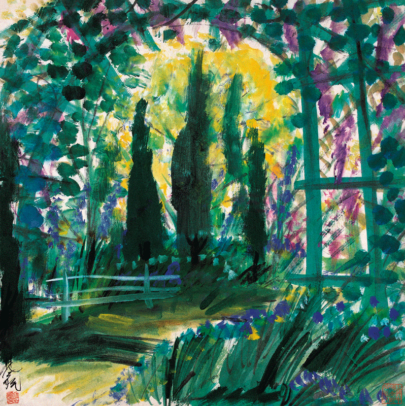 从近代以来,上海就是中西融合的最佳试验场,画家们的公园主题创作正是其中一角精微的缩影。上海画家带着速写本走进公园,用笔墨记录市民的休憩场景,在传统笔墨中大胆融入多重技法创新,使作品兼具自然生机与生活气息。在“中西融合”的艺术探索中,上海画家的公园主题创作既保留了传统笔墨,又注入了时代符号。当一位画家拿起他的画笔,开始描绘一座公园的时候,这座城市园林正在从传统绘画中象征隐逸理想的“林泉高致”,转化为普通市民休憩游玩的公共空间,水墨中的一草一木都经历着时代潮流的洗礼。黄浦江边的晨曦,紫藤架下的花影,九曲桥上的少年——画家用画笔将“林泉之心”移植到了现代都市生活之中,探索的不仅是绘画语言的绵延新意,也是艺术与生活的永恒对话。