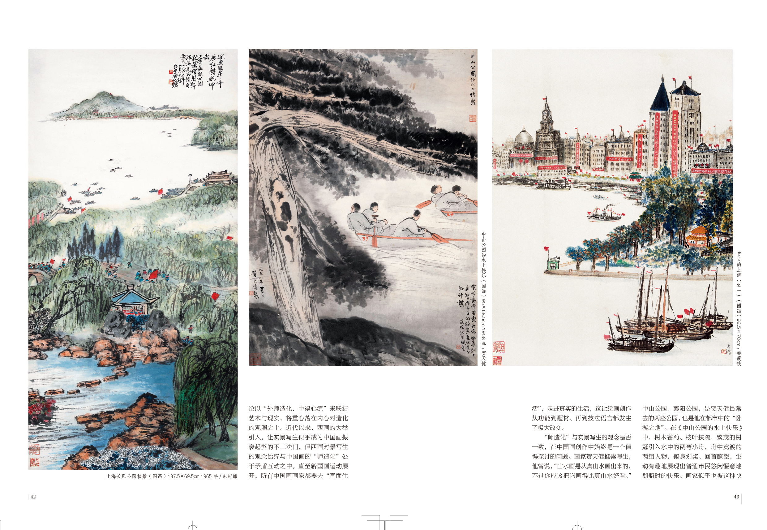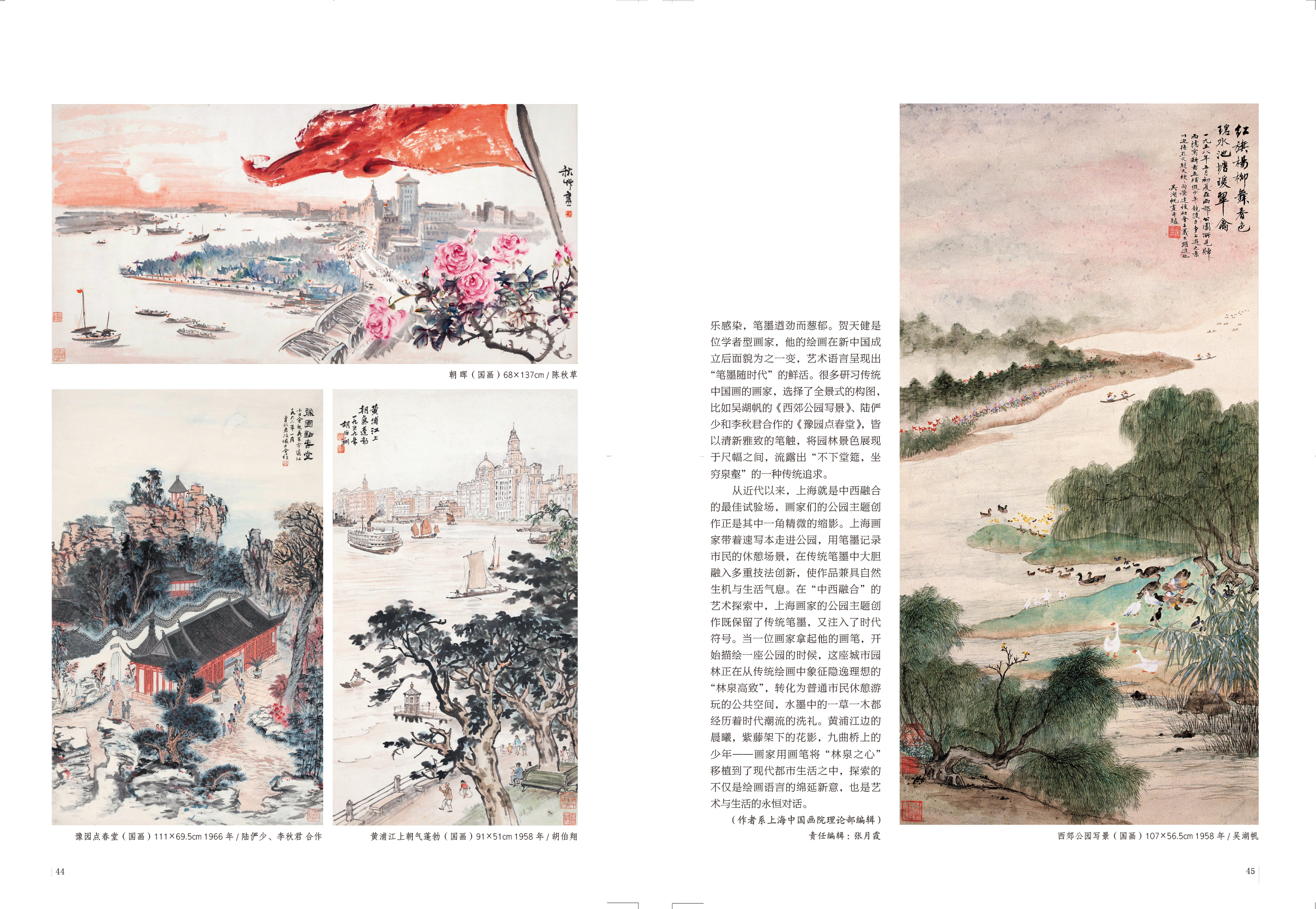 “师造化”与实景写生的观念是否一致,在中国画创作中始终是一个值得探讨的问题。画家贺天健推崇写生,他曾说,“山水画是从真山水画出来的,不过你应该把它画得比真山水好看。”中山公园、襄阳公园,是贺天健最常去的两座公园,也是他在都市中的“卧游之地”。在《中山公园的水上快乐》中,树木苍劲、枝叶扶疏,繁茂的树冠引入水中的两弯小舟,舟中竞渡的两组人物,俯身划桨、回首瞭望,生动有趣地展现出普通市民悠闲惬意地划船时的快乐。画家似乎也被这种快乐感染,笔墨遒劲而葱郁。贺天健是位学者型画家,他的绘画在新中国成立后面貌为之一变,艺术语言呈现出“笔墨随时代”的鲜活。很多研习传统中国画的画家,选择了全景式的构图,比如吴湖帆的《西郊公园写景》、陆俨少和李秋君合作的《豫园点春堂》,皆以清新雅致的笔触,将园林景色展现于尺幅之间,流露出“不下堂筵,坐穷泉壑”的一种传统追求。