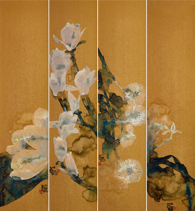 清朗十页之荷、玉兰、菊、兰(国画)147×35cm×4 2015年 /林 蓝