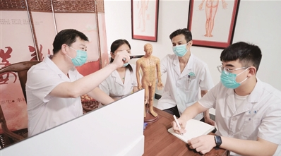 盛广勇(左一)带领团队进行经络腧穴业务研讨学习。(图片由受访者提供)