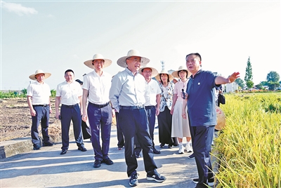 调研组在眉山市东坡区太和镇永丰村考察水稻种植情况。