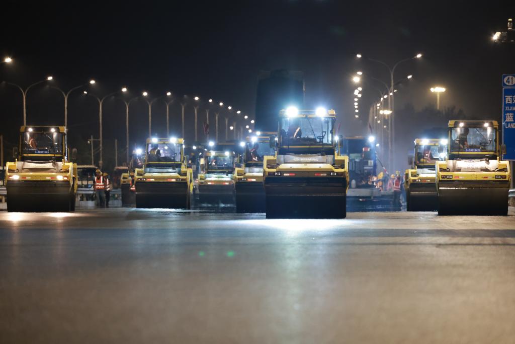 经过前期充分调研和方案论证,在夜间23点至次日5点,数百名建设者、数十台大型机械提前集结,在强大的现场协调、施工组织能力加持下,多个作业面同步施工,无缝衔接地完成了旧路铣刨、新料摊铺、精细顺接等一整套工序。