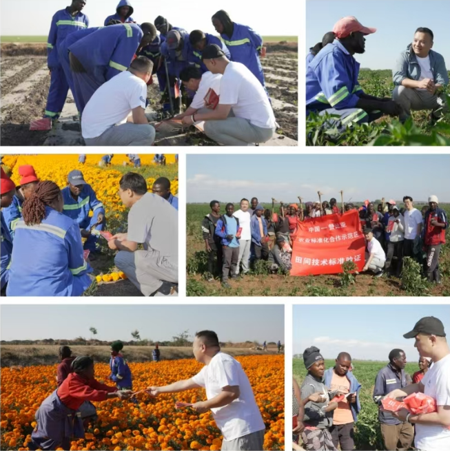 在生机盎然的辣椒和万寿菊田地里,一个个不同工种的赞籍工人正在忙碌着补苗、栽种和采收工作。中国专家走进田间,仔细观察种植工人的操作方法,手把手指导他们严格按照技术手册要求,执行播种深度、移栽时株行距、定植深度、水肥管理等要点。