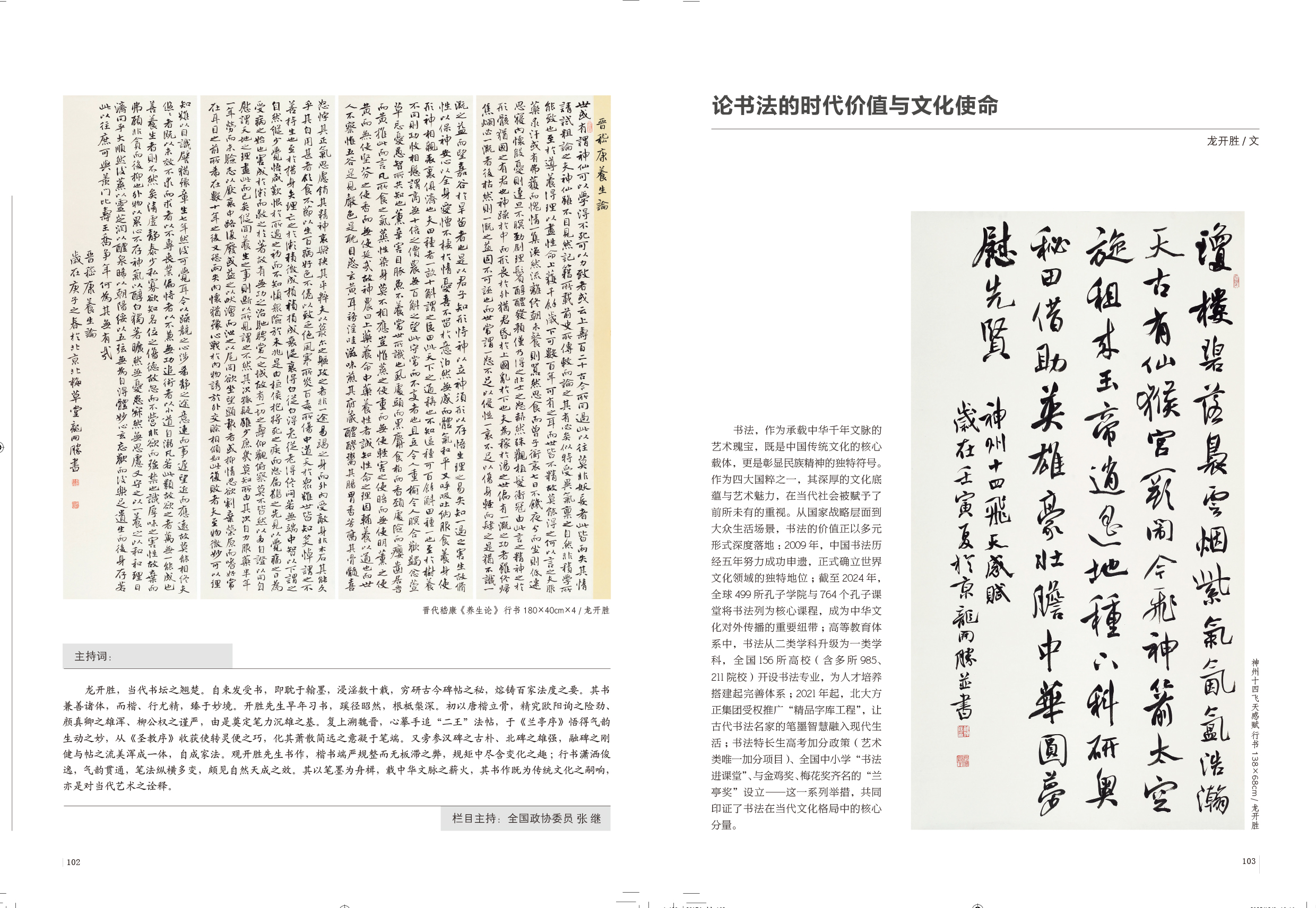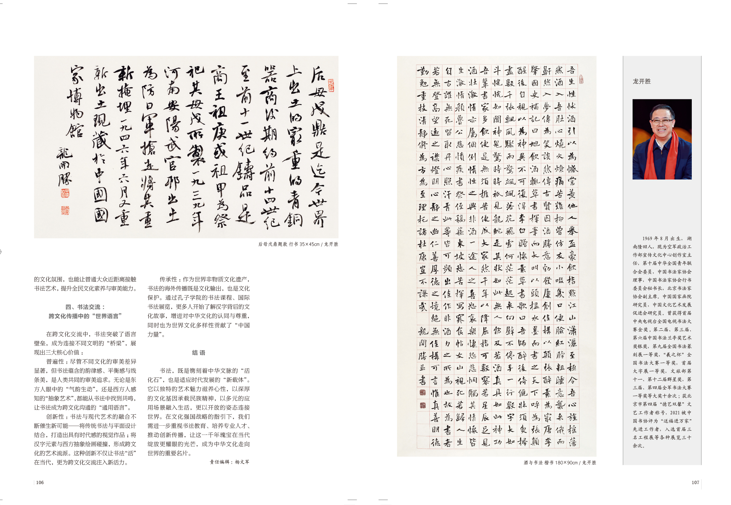 龙开胜,当代书坛之翘楚。自束发受书,即耽于翰墨,浸淫数十载,穷研古今碑帖之秘,熔铸百家法度之要。其书兼善诸体,而楷、行尤精,臻于妙境。开胜先生早年习书,蹊径昭然,根柢槃深。初以唐楷立骨,精究欧阳询之险劲、颜真卿之雄浑、柳公权之谨严,由是奠定笔力沉雄之基。复上溯魏晋,心摹手追“二王”法帖,于《兰亭序》悟得气韵生动之妙,从《圣教序》收获使转灵便之巧,化其萧散简远之意凝于笔端。又旁参汉碑之古朴、北碑之雄强,融碑之刚健与帖之流美浑成一体,自成家法。观开胜先生书作,楷书端严规整而无板滞之弊,规矩中尽含变化之趣;行书潇洒俊逸,气韵贯通,笔法纵横多变,颇见自然天成之效。其以笔墨为舟楫,载中华文脉之薪火,其书作既为传统文化之嗣响,亦是对当代艺术之诠释。
