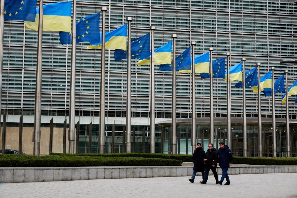 2月24日,在比利时布鲁塞尔,人们走过欧盟总部。新华社记者孟鼎博摄