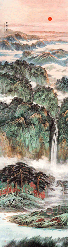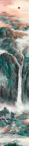 创作设计稿为三段式构图。近景为平远法,画白洋淀的湖泊、芦苇、荷叶以及水岸边的古典建筑,体现典藏书阁的传统积累,共同筑建一个理想的天下大同生活场景,这也是中国传统社会的重要价值追求。中景以山林、松柏、红叶为山基,高山仰止拔地而起,此段景象不求空灵通透,但要山崖嵯峨,群峰如嶂,叠嶂之中飞瀑高挂如天际之水垂落湖面,此为高远法。远景为深远法,云海涌动于群峰之中,如海之波涛,滚滚向远推去,一轮红日高挂天际,画面左侧“山河赋”三个篆书正字,落款为“文化和旅游部艺术发展中心”。