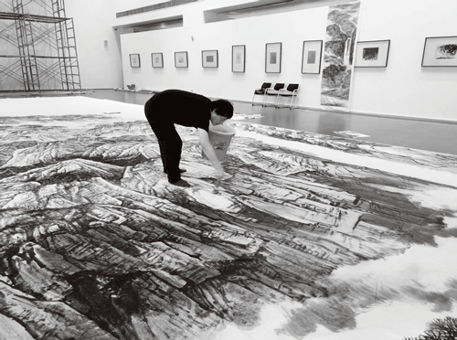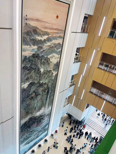 雄安图书馆特殊的空间位置,使得中国水墨画,尤其是山水画中最重要的审美思想得到体现。北宋郭熙在《林泉高致》中提到的“不下堂筵,坐穷泉壑”的审美要求,通过这张巨幅山水画,突现“可观”“可游”“可居”三个理想的神游层次,如此就赋予了山水画超越自然景观的精神价值。雄安图书馆大厅的空间正好提供了一个把画幅延伸到整个空间而不只是欣赏一个微缩画面的理想位置。这样就可以使观众进入图书馆后有身临其境的震撼感。作品展陈后,在现场和网络上看到观众的反应也正如草稿的设计效果。