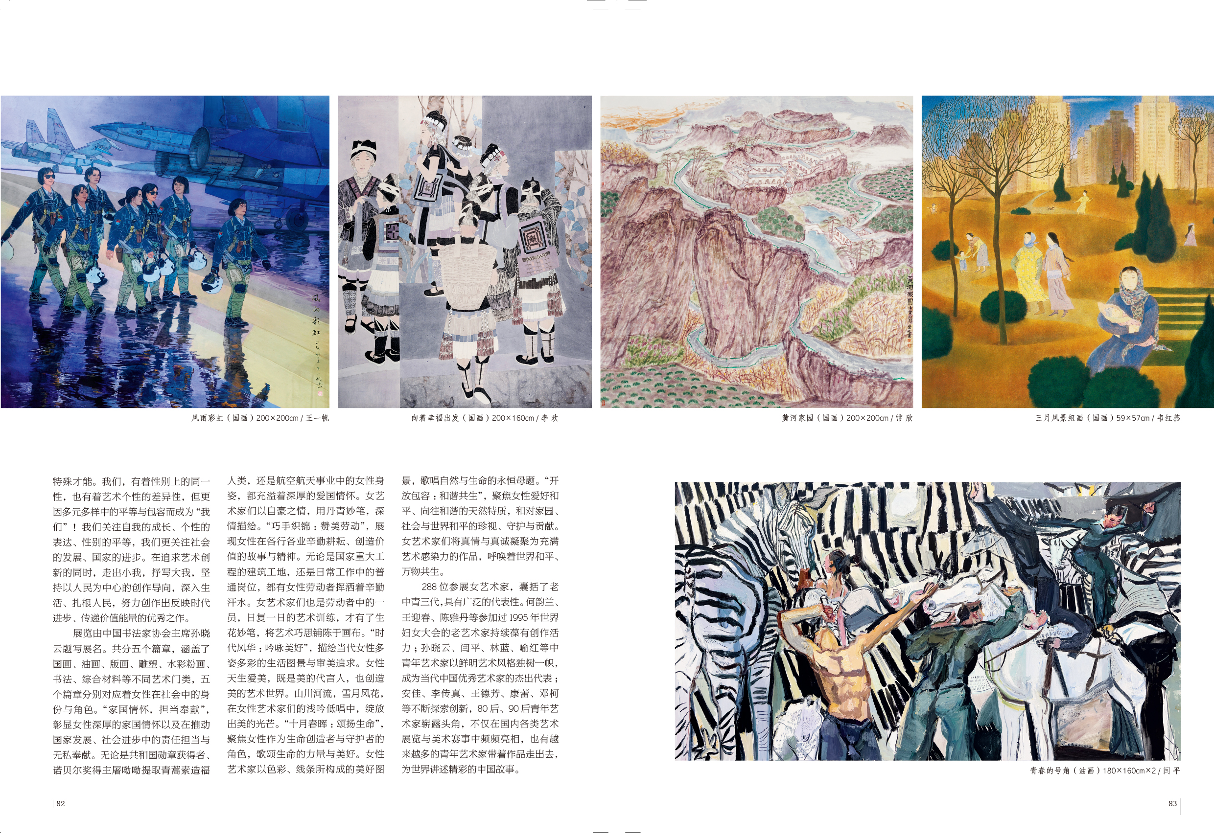 288位参展女艺术家,囊括了老中青三代,具有广泛的代表性。何韵兰、王迎春、陈雅丹等参加过1995年世界妇女大会的老艺术家持续葆有创作活力;孙晓云、闫平、林蓝、喻红等中青年艺术家以鲜明艺术风格独树一帜,成为当代中国优秀艺术家的杰出代表;安佳、李传真、王德芳、康蕾、邓柯等不断探索创新,80后、90后青年艺术家崭露头角,不仅在国内各类艺术展览与美术赛事中频频亮相,也有越来越多的青年艺术家带着作品走出去,为世界讲述精彩的中国故事。