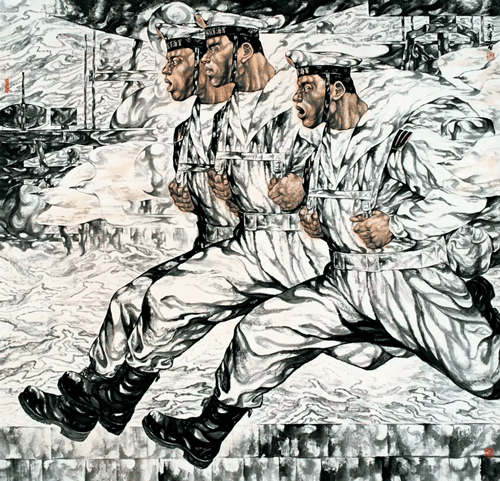 在王利军的笔下,与惠安女绘画的艺术风格迥然不同的,是那些坚硬的、刚毅的、以大海为伍的海军官兵们生龙活虎的形象。作为一位军旅画家,他生活的根与笔墨的触须永远扎在军营和哨所。无论是在军舰的甲板上,还是在船舷上;无论是在波涛汹涌大海上,还是在夜晚静悄悄的海港,画家艺术的根脉、生活的源泉,人物形象的捕捉以及创作灵感的生成,都离不开他亲如兄弟的战友们。画家自觉地以一种充满了敬畏的心态把他们呈现在不同的画面里,让战士们的身影从波涛中从容地走进艺术的宫殿。用王利军自己的话说“这是我作为一名职业画家的天职和使命”。