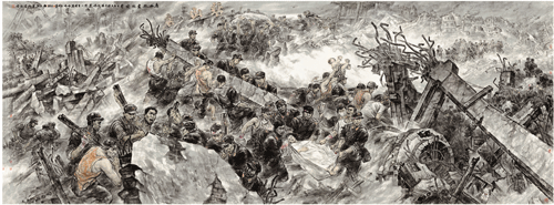 画家在谈到创作感受时,曾激动地说:“就这样,我熬过了一千多个日日夜夜,在铺着宣纸的水泥地上像一条虫一样爬来爬去。将160多位英雄形象和他们托起的生命从50年前那片瓦砾的废墟中真实地还原、打捞到画面上来。肩负着这一使命,我像背着一座山一路挺过来,历经艰辛疲惫、孤独煎熬以及夹杂其间的激情冲动与喜悦亢奋,酸甜苦辣百般滋味瞬间涌上心头,禁不住鼻头泛酸,眼泪不自觉地就流了下来—”。