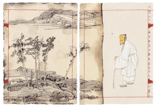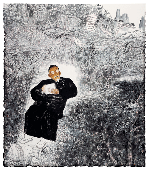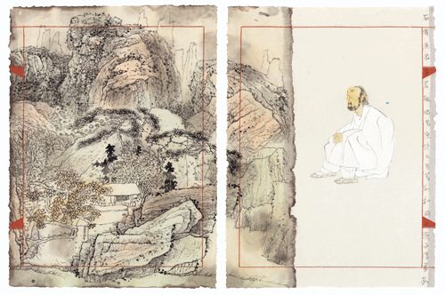 与此同时,袁武人物画的大哉问则是关乎生命意义的哲学冥想和叩问。从《大山水系列之在朱耷山水上耕种》起始及至《大江东去系列》《百年肖像系列》的视觉位移,是在于将人物落实于千年山水传统的时空架构上获得一种现实与历史对话的结构性力量,在时空错置的对位上揭示某种意义诠释的丰富性和复杂性,从而让主题演绎寻求更为多元开放的公共性表达。毁誉臧否,青山为证;黄钟大吕,空谷回响!