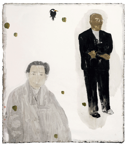 有评者说,袁武的“百年肖像”是以评史、写史、画史的自觉意识进入创作,就是用历史人物肖像来“写百年、画百年、评百年,为百年立传”。在他的“百年肖像”中,李鸿章身后的山水画是黄公望的《天池石壁图》,黄兴身后的山水画是巨然的《层岩丛树图》等。“人物+山水画”的形式宛如一种“册页”式的图像文本,让观者在视觉的阅读过程中充盈了丰富的想象力及妙趣的灵想。这种灵想有如文学中的通感和互文,深得春秋笔法的要义,同时又有着一种雄浑空蒙的博大和禅机的幽微。所谓“飙风天际来,绿压群峰暝”,观其大象,颇有浪淘尽千古风流人物之意象,读之酣畅淋漓!