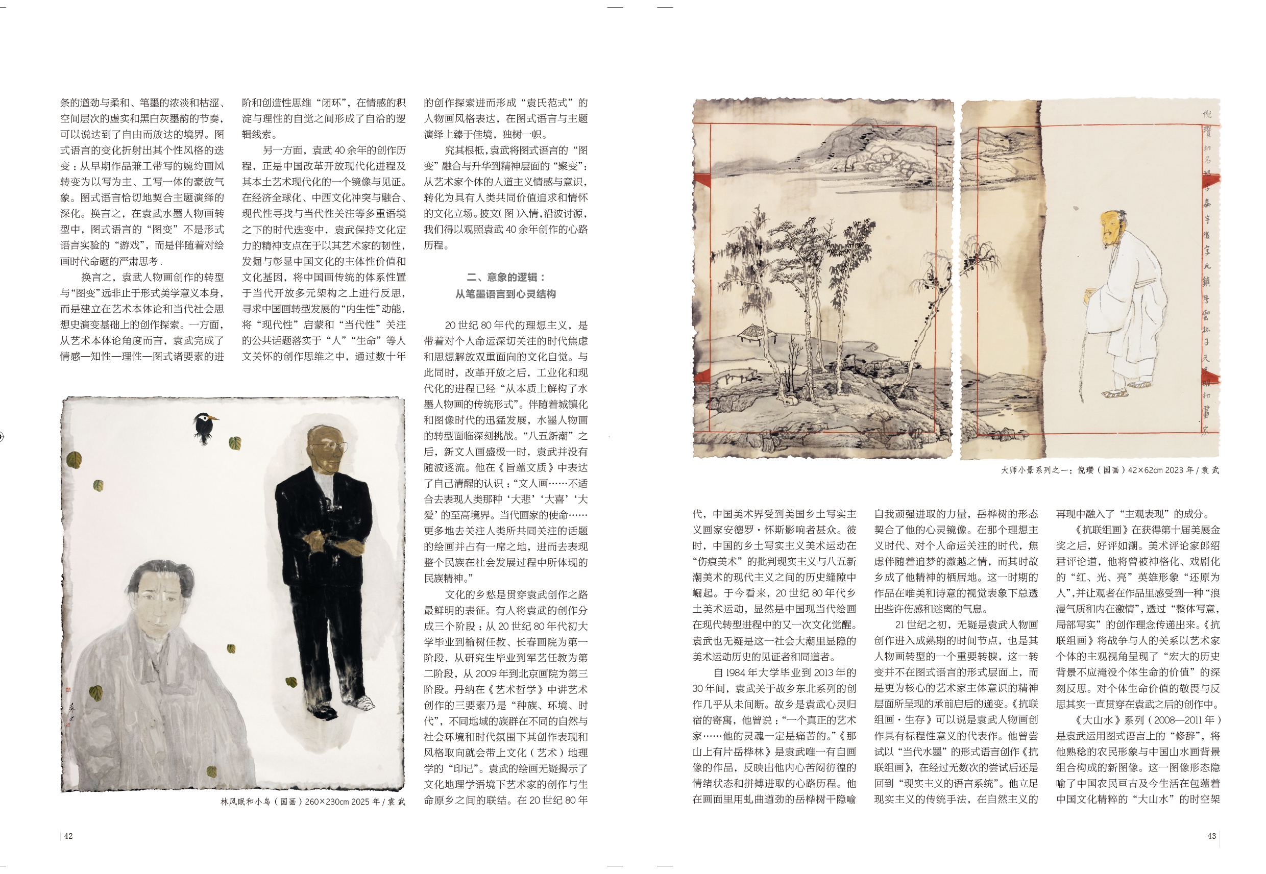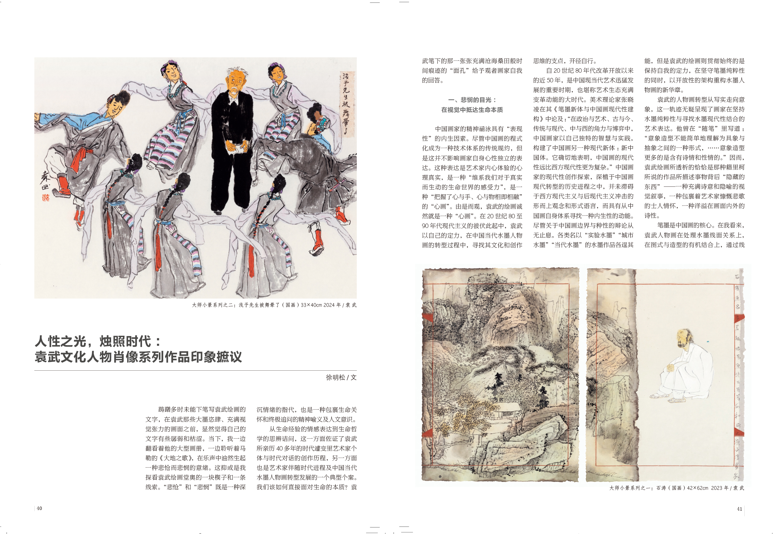 20世纪80年代的理想主义,是带着对个人命运深切关注的时代焦虑和思想解放双重面向的文化自觉。与此同时,改革开放之后,工业化和现代化的进程已经“从本质上解构了水墨人物画的传统形式”。伴随着城镇化和图像时代的迅猛发展,水墨人物画的转型面临深刻挑战。“八五新潮”之后,新文人画盛极一时,袁武并没有随波逐流。他在《旨蕴文质》中表达了自己清醒的认识:“文人画……不适合去表现人类那种‘大悲’‘大喜’‘大爱’的至高境界。当代画家的使命……更多地去关注人类所共同关注的话题的绘画并占有一席之地,进而去表现整个民族在社会发展过程中所体现的民族精神。”