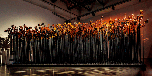 2009年的秋冬季,我们制作了上千个葵头与莲蓬头。在丰实的泥团上,裁上小条状的泥条,如若硕盆吐蕊。再用泥面一片片地将葵盘包裹起来,又若火舌招展。把这葵头制成铜,制成铝,经过打磨,熠熠发光。这一枝枝葵头让我想到烛火,又想到我在荒原里读过的书。把葵头插在长长的秆上,仿佛火与书在荒原上飘扬。这葵又与莲比肩并立,这生长在沙土与水泽中的垂直的生物能否共生?这火与书会否因燃烧而共生?某种荒原意象訇然生长。“知我者,谓我心忧;不知我者,谓我何求。”后来,我们将葵头、莲头锻成红色,苍茫茫的一片,连成火的荒原。