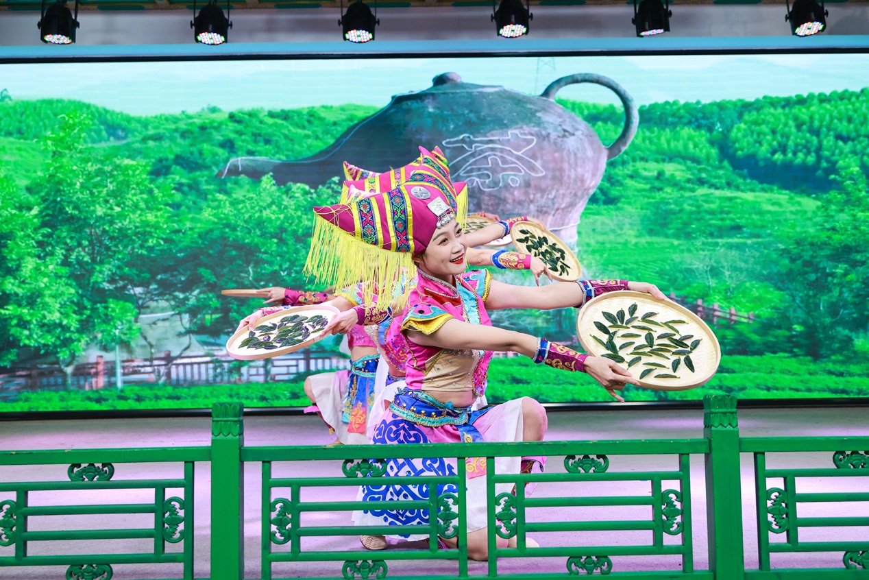身着壮族传统服饰采茶姑娘的轻盈起舞,背景是云雾缭绕的广西茶山。