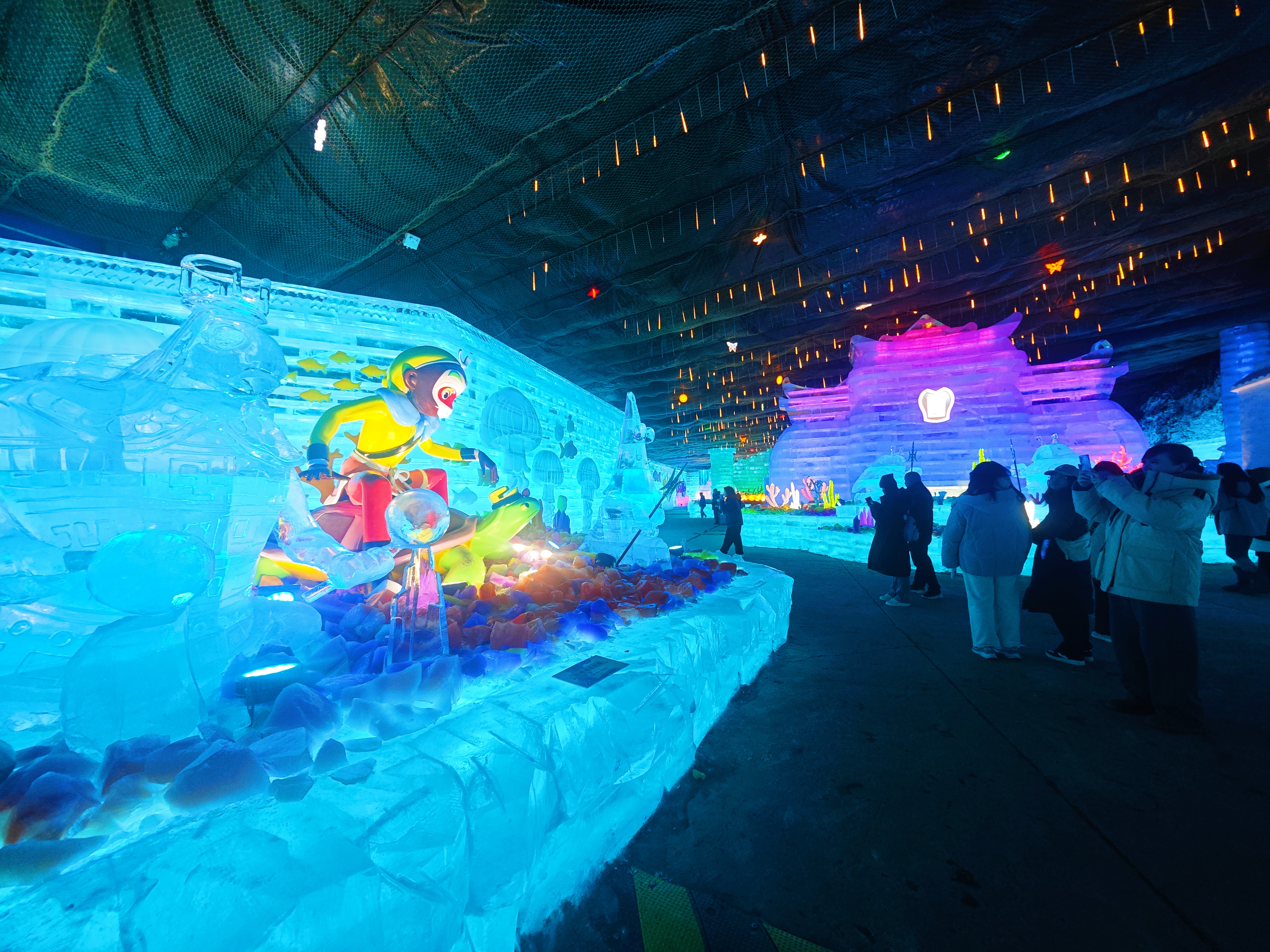 作为华北地区规模最大、历史最久的冰灯艺术展,本届艺术节在规模与体验上全面升级,50万平方米展区中,20万平方米花灯冰灯展区与30万平方米天然冰川峡谷景观相映成趣。核心冰灯展区以“灵猴现世”“龙宫借宝”等四大板块构建《大闹天宫》完整故事线,20余组大型主题冰建筑、150余件精美冰雕作品还原经典场景,13.6米高的“南天门”冰建筑气势恢宏,动态光影与静态冰雕的融合让经典剧情鲜活再现;“马上封侯”展区以冰川飞瀑为背景,彩冰浮雕呼应2026马年氛围。花灯展区则汇集18组大型主题灯组、180件小型花灯,生肖贺岁、神话传说等主题灯组洋溢浓浓年味。