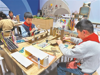 在中国科技馆“探桥空间”研学体验区,孩子们自己动手搭建桥梁模型。王慧文 摄