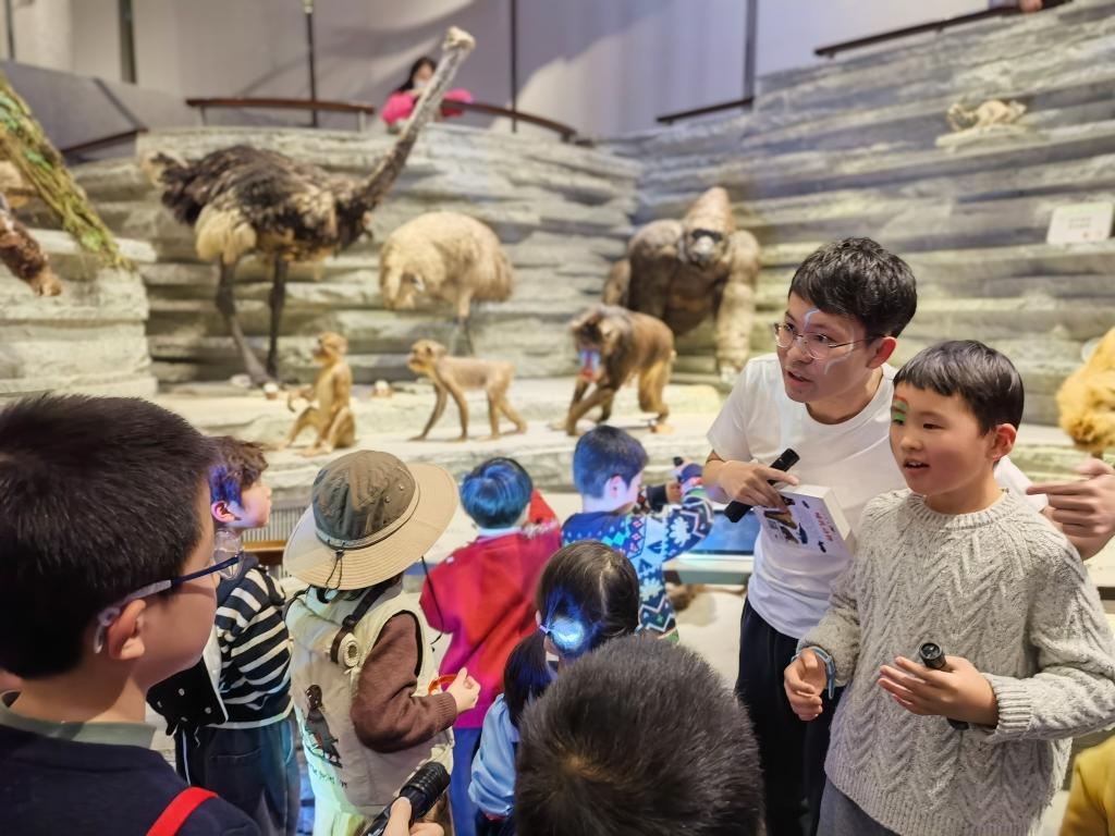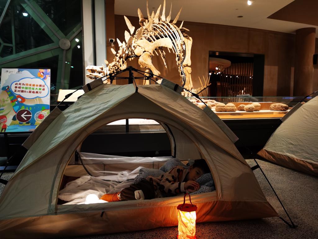 1月31日晚,约90组亲子家庭在上海自然博物馆内化身“动物王国探险家”,聆听科普讲座,观看《羽龙传奇》科普电影、“生命长河”沉浸式戏剧和《非洲秀》,再前往馆内不同展区观察动物化石的特征……完成一系列“探险”任务后,游客通过抽签的方式前往馆内预设点位扎起露营小帐篷,开启自然博物馆内的亲子夜宿。