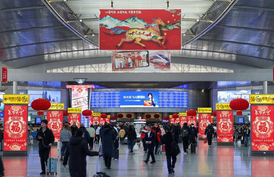 走进天津站候车厅,扑面而来的是一股热闹劲儿。大红灯笼、大型中国结高悬各处,电子屏持续滚动马年春节主题图片,浓厚的过年氛围感染着每一位往来旅客。
