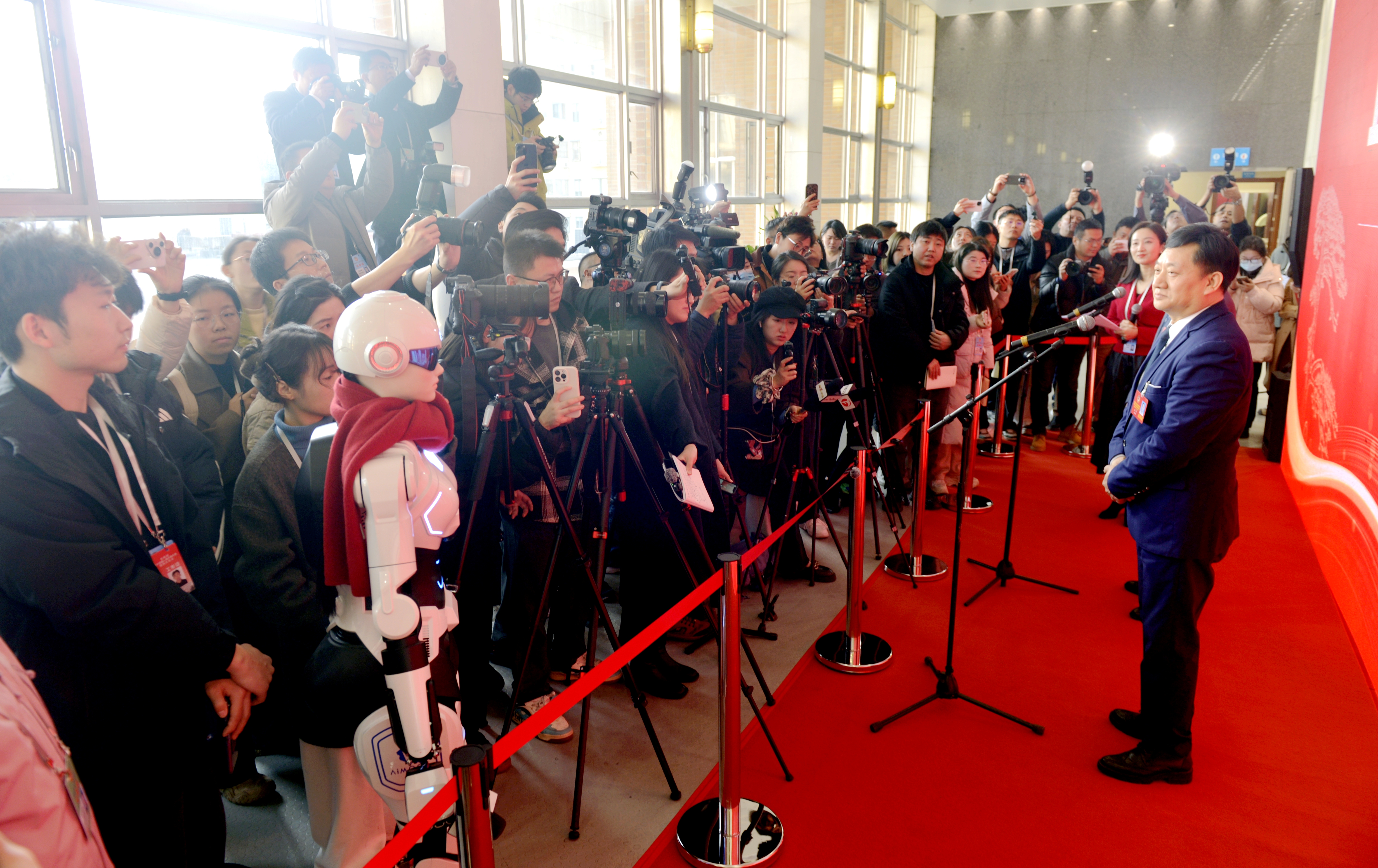 近年来,随着具身智能和人形机器人产业蓬勃发展,安徽正加快打造具有全球重要影响力的智能机器人产业高地。在今年的安徽省两会上,数款机器人记者亮相,成为会议报道中的新风景。(胡方玉 摄)