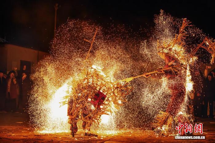 中新网山东邹城2月5日电 (沙见龙 宋文强)“开门放虎!”夜幕降临,随着广场灯光骤然熄灭,密集的锣鼓声响起。一名身负特制“火甲”的表演者踩上高跷,周身瞬间迸发出数千条金色火线,宛如猛虎现身。与之对峙的“打虎人”手持火捻哨棒,腾挪扑闪间,火星如瀑流泻,照亮夜空。