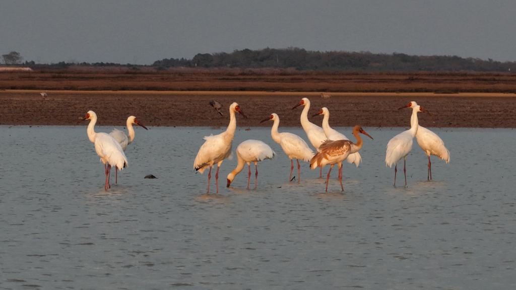 归家路上,暖阳洒在湿地浅滩,映照着上百只黑鸬鹚与东方白鹳自在嬉戏,余奇文迅速按下相机快门定格了这一画面。