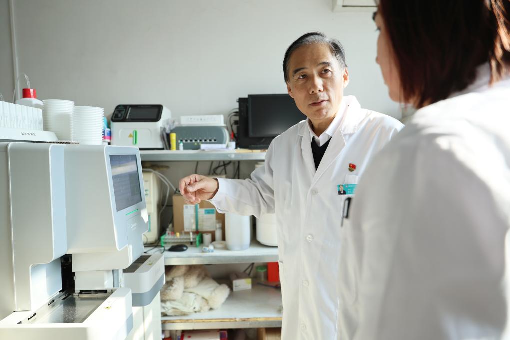 在天津市蓟州区穿芳峪镇卫生院,刘宏亮和同事交流血检情况(2月4日摄)。
