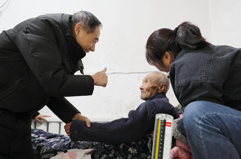 在天津市蓟州区穿芳峪镇果香峪村,刘宏亮和患者交流身体情况(1月30日摄)。