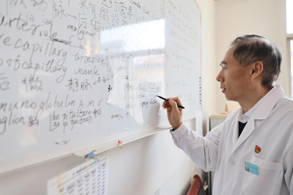 在天津市蓟州区穿芳峪镇卫生院,刘宏亮将学术期刊中的英语词汇记录下来(2月4日摄)。