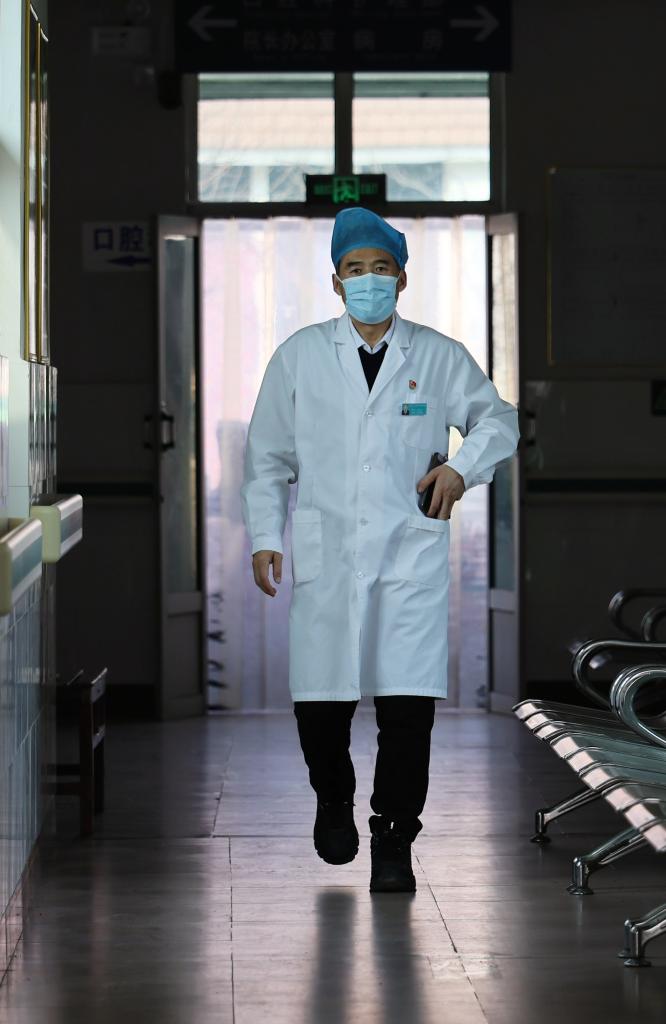 刘宏亮在天津市蓟州区穿芳峪镇卫生院前行(2月4日摄)。