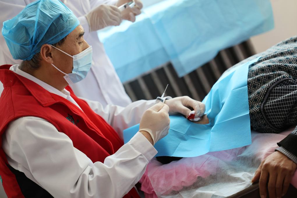 在天津市蓟州区穿芳峪镇卫生院,刘宏亮在给患者治疗(2月4日摄)。